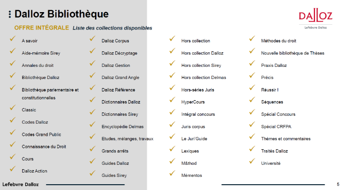 Retrouvez l'intégralité des collections de la bibliothèque Dalloz-Lefebvre, entre autres : Annales du droit, Codes Dalloz, Cours, Etudes, Mélanges, Travaux, Grands arrêts, Hypercours, Mémentos, Spécial Concours et CRFPA...