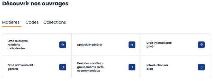 - Vous accédez aux ouvrages par matières, ou collections, et une entrée spécifique est proposée pour les Codes.